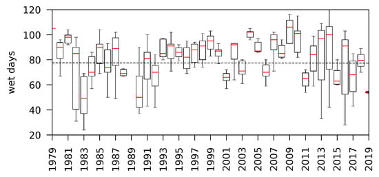 Annual wet days recorded at the 7 stations (25% and 75% percentile, median (red)) and trend 1979–2019 (dashed line).