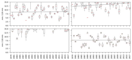 Seasonal maximum precipitation intensities for 120 minutes of the 7 stations (25% and 75% percentile, median (red)) and the trend 1979–2017 (dashed line).