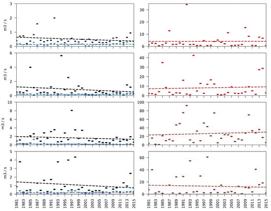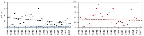 Observed mean annual minimum flows were increasing 1981–2016 around 0.11 ms with the smallest recording in 2002 (0.03 ms) and the largest recording in 2014 (0.24 ms) (Figure 9 left). Observed mean annual maximum flows showed no significant trend 1981–2016 around 31.10 ms, with the largest observation in 1992 (92.14 ms) and the smallest observation in 2015 (5.61 ms) (Figure 9 right).