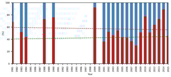 Annual water balance as fallen precipitation (100%, blue) and runoff fraction (red). The dashed lines mark the long-term trend of the runoff fraction (red) and the actual evapotranspiration fraction (green) 1981–2015. Missing years did not provide sufficient runoff data for a cumulative annual runoff value.