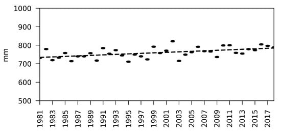 Long-term hydrological trends and their significance were computed using the non-parametric modified Mann–Kendall test [] to reduce the influence of serial correlation. Additionally, the Theil–Sen robust estimate was computed [,] to evaluate the magnitude of the trend. This approach has been successfully used to assess climate developments in numerous earlier studies (e.g., [,,,]) and was therefore applied in the current study.