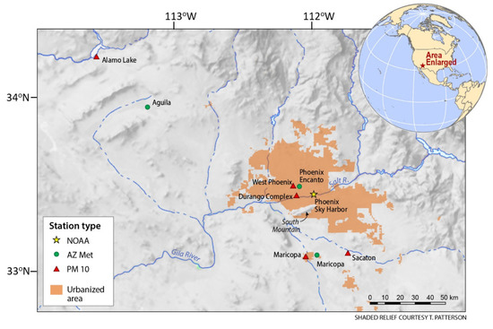 The Sky Harbor International Airport site is located near a dry bed of the Salt River within the urbanized area of the city of Phoenix and is subjected to high air pollution episodes [13]. The AZMET site of Phoenix Encanto, simply called Encanto in this paper, is situated in the middle of the city of Phoenix, not far from Sky Harbor International Airport and in a dense residential area on the western edge of a golf course on year round irrigated turf. This site is also not far from an air quality site used in this study (West Phoenix PM10) and was chosen as a shortwave irradiance urban site. North and south of Phoenix are rural AZMET sites on entirely agricultural landscapes; one northwest of Phoenix at the small town of Aguila, and one near the town of Maricopa ~50 km to the south (Figure 1). Aguila is higher in elevation and out of the air shed of the Salt River Valley. We were less confident in using this site, since it is over 100 km from the urban area and 323 m higher in elevation, but is out of the Salt River Valley airshed. PM10 data were from the nearby monitoring sites of Sacaton and Maricopa near the Maricopa AZMET site, and the Alamo Lake PM10 monitoring site is representative of background rural values and is north of the Phoenix area near Aguila (note all sites in Figure 1). Three databases are used in this study and are reviewed in Section 2.2.