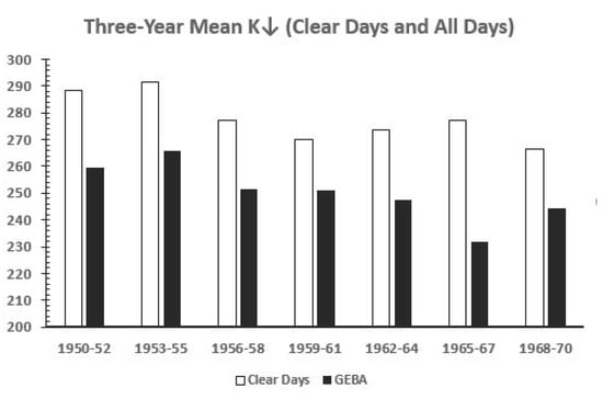 Understandably, the clear day values were higher than the GEBA records because the GEBA data include all days. A downward change from 1950–52 to 1968–70 for clear days from [18] is evident. The resultant decrease for the clear day values was −7.0% [18]. The period 1965–67 for the GEBA data departs significantly from other periods and is also shown in Figure 5. However, the value for the clear day mean for this period did not drop because of any apparent instrument error, indicating that cloudiness, as suggested above, significantly impacted all the sky annual totals shown in the GEBA record. Since we added a correction that we know about for this same period (possible instrument errors), it is likely that the remaining dip in the record for 1965–67 is related more to synoptic effects [22].