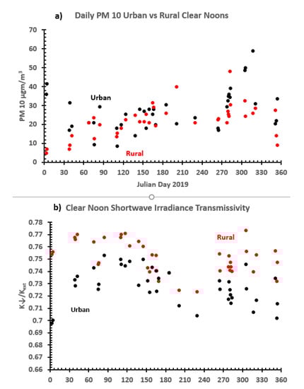 We determined the correlation of Maricopa–Encanto differences in transmissivity (from Figure 5b) versus differences in urban minus rural PM10 (from Figure 5a). With N = 39, the r value was 0.55, p = 0.000, indicating larger differences in T for higher PM10 in the urban environment than in the rural surroundings. Our r value was similar to those reported by [33,34], who compared PM10 to urban/rural global radiation attenuation in % on a daily basis.