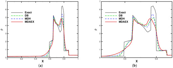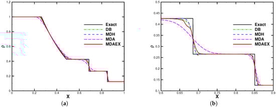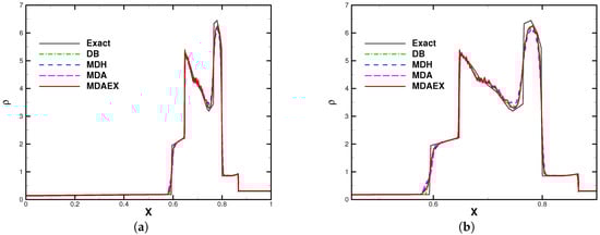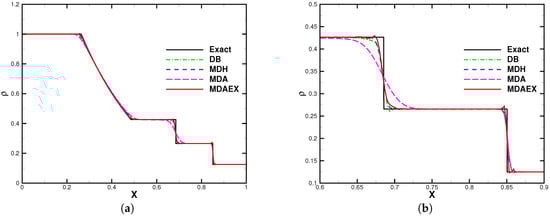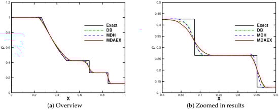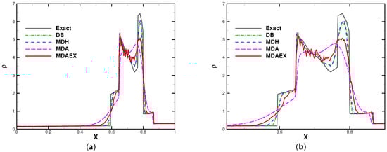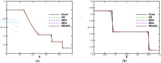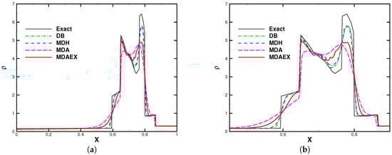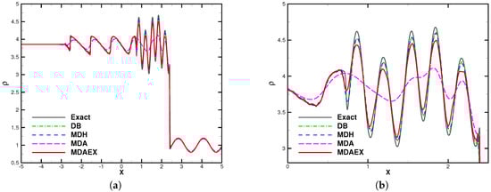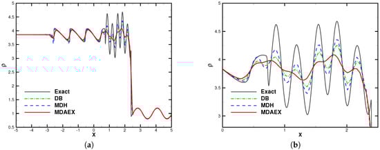 The number of elements was fixed to 200 for all of the computations. The computation was stopped at and the results are shown in Figure 8, Figure 9, Figure 10 and Figure 11. In the region of entropy waves, MDAEX is dissipative for and similar to DB and MDH for , with fewer peaks of fluctuations, which is consistent with the history of viscosity shown in Figure 12. Furthermore, as can be seen in Figure 12, MDA ceases to be effective whereas MDAEX captures the typical structures well.