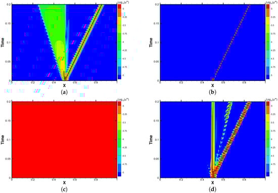 Finally, the divergence of the continuous flux is calculated at the solution points to update the solution. In this paper, the left and right Radau polynomials were chosen as correction functions and , respectively, which recover the standard DG scheme []. The strong stability preserving five-stage fourth-order Runge–Kutta (SSPRK54) [] was adopted for explicit time integration in the numerical experiments in this paper.