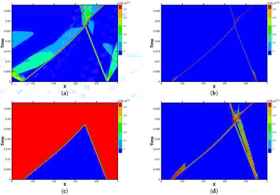 Temporal history of artificial viscosity for the one-dimensional Shu–Osher problem with 200 P2 elements for . (a) DB; (b) MDH; (c) MDA; (d) MDAEX.