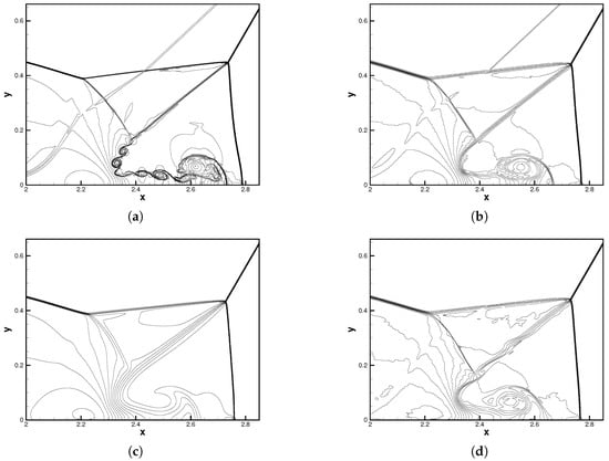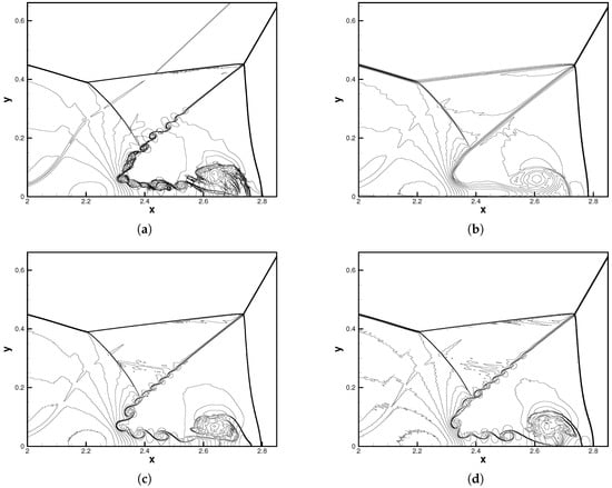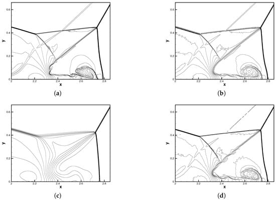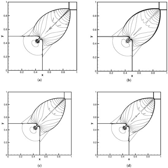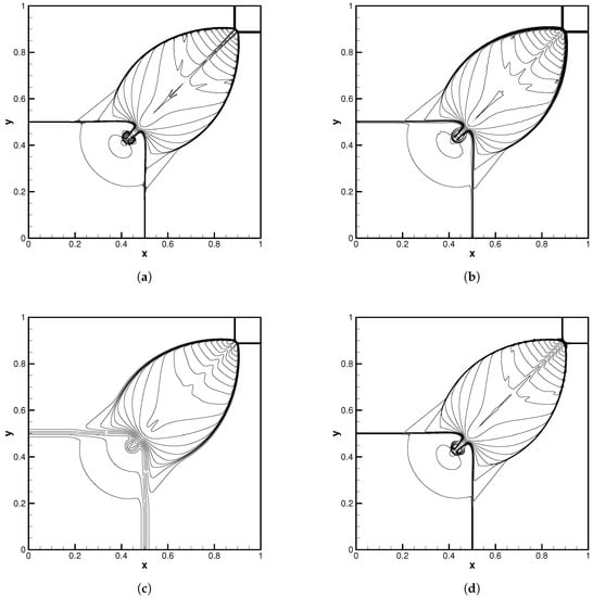 In this section, we considered a two-dimensional Riemann problem []. The computational domain is , which is uniformly divided by quadrilateral elements. The number of elements along each edge was fixed to 160. For this case, the initial condition (known as Case 12) is given as