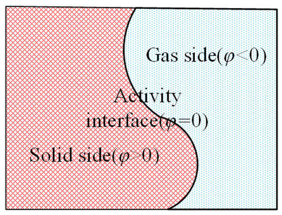 The solid area is set as , the gas area as , and the interface as . The function φ is defined to calculate the conforming distance from any point in the region to the interface, as shown in Equation (5).