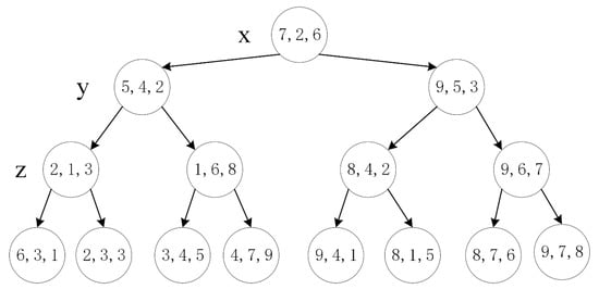 The distance value of each grid point is difficult and computationally intensive, and an efficient data structure is needed to quickly search for the minimum distance from the grid point to be calculated to the burning surface. The nearest neighbor algorithm in machine learning provides a K-d tree, which is a spatial division data structure often used for searching in high-dimensional spaces. The basic idea of the K-d tree is similar to that of the binary tree but differs in that each node represents a sample. The sample is divided into different nodes by selecting a certain dimensional feature in the sample, first sorted by the x coordinate. The middle xmid is selected as the root node, and then the points smaller than xmid are in the left subtree, and those larger than xmid are in the right subtree. Then the left and right subtrees are sorted by the y coordinate, and so on (see Figure 5).