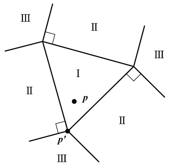 When the grid points are close to the burning surface, the three nearest discrete points are selected to form the surface, as shown in Figure 6, and can be divided into three cases. The first case: When the point p is located in region I, this case is the distance from the point to the face. The second case: When the point p is located in region II, this case is the distance from the point to the line segment. The third case: When point p is located in region III, this can be approximated as the distance from point p to the nearest point.