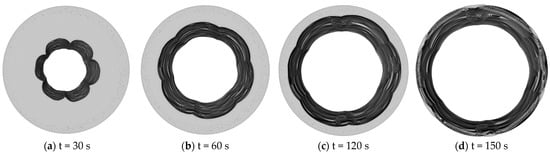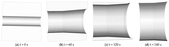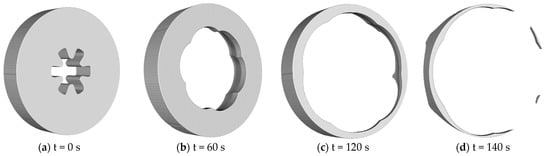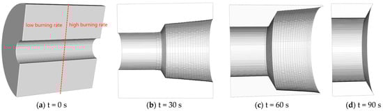 A computational simulation of tube grain under erosive burning effect was performed using the synthesis algorithm. It can be visualized from Figure 10 that at the beginning of the burning phase, the overall motor burning rate is high and the erosive burning effect is obvious. In the late stage of the burning, the gas channel shows a small front and large rear cone, and the erosive burning effect almost disappears. Although the erosive burning effect disappears in the later stages of the work, the conical channel formed at the beginning continues to have an effect, which causes an early reduction of the burning surface in the final stages of the work.
