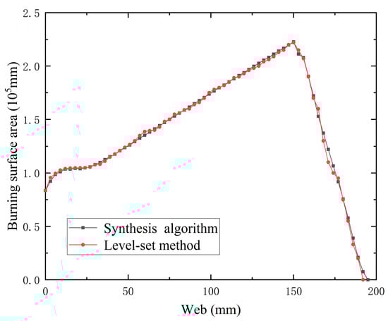 Figure 9 shows the change in the area of the burning surface of the NAWC No. 6 partial grain during the burning process. In comparison with the LS method, it can be seen that the synthesis algorithm in this study has less computational error. Since the synthesis algorithm does not require frequent initialization of the mesh, the calculation is more stable when the burning surface changes less regularly. Both the synthesis algorithm and the LS method can be used to calculate the burning surface regression for the actual motor grain to provide a basis for the internal ballistics of the motor grain, and are equally applicable to irregular grains.