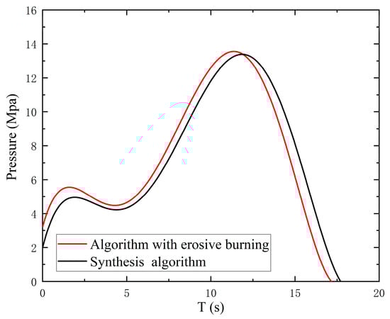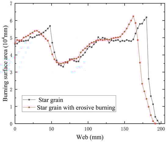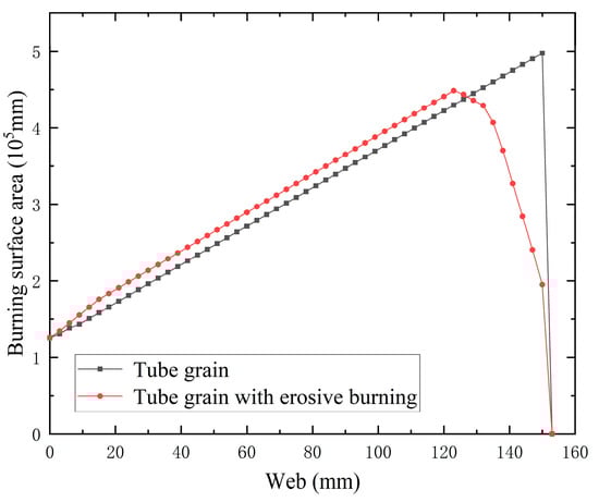 Figure 11 shows the calculation with the erosive burning effect compared with the calculation with the geometrical law of burning. Since erosive burning mainly occurs at the early stage of motor operation, the erosive burning effect can have a profound effect on the later operating condition of the motor. The erosive burning severely affects the peak burning area of the tube grain, with the result that the motor fails to reach the theoretical level of operation, and the burning surface gradually decreases in the later stages of operation, which may lead to abnormal motor thrust.