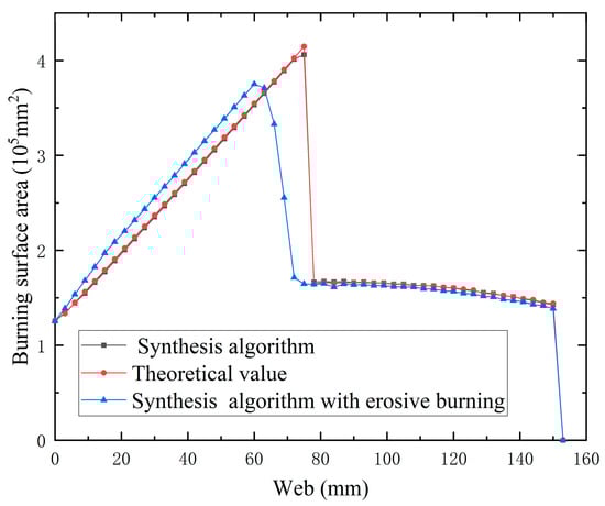Comparison of the burning surface area of geometric theoretical value with synthesis algorithm under erosive burning and under geometrical law of burning.