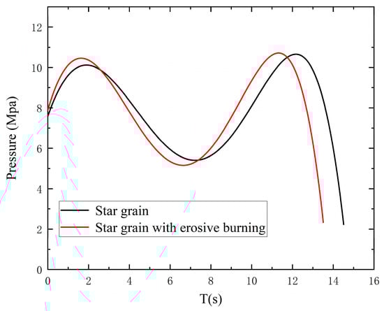 Generally, the pressure trace of the SRM follows the trend of the total burning surface area of the grain after the ignition transient stability. Figure 16 and Figure 17 show the 0-D internal ballistic pressure curves of the NAWC No. 6 partial grain and star grain. It can be seen that this part of the grain is basically in conformity with this rule. After a short initial pressure peak (approximately 13 ms), the pressure change increases with the increase in the total burning area. The erosive burning effect increases the average burning rate of the grain during the early working period, resulting in an increase in the peak initial pressure. It also causes the peak pressure to come earlier in the late working phase and shortens the total operating time of the motor.