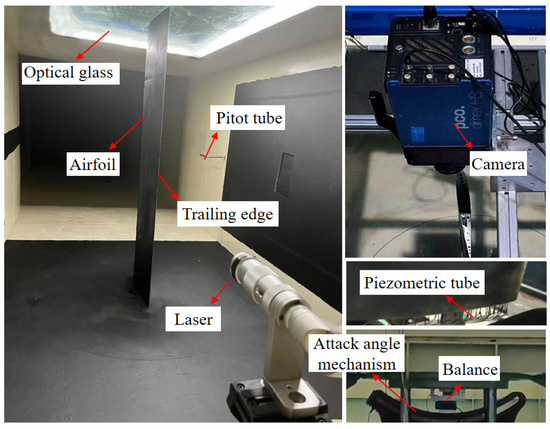 The experiment was carried out in the low-turbulence recirculation wind tunnel of the Nanjing University of Aeronautics and Astronautics. The wind tunnel test section measured 3.0 m along the streamwise direction and had a rectangular cross-sectional area of 1.5 m × 1.0 m. The wind tunnel’s turbulence intensity, the airflow’s deviation angle, and dynamic pressure stability coefficient were less than 0.5%, 0.2°, and 0.05, respectively, and the design’s stable wind speed ranged from 5 to 100 m/s. The test section window was equipped with optical glass to provide high-level imaging. The wind tunnel’s experimental system, which mainly involves an aerodynamic-balance force measurement system, a pressure testing system, and a TR-PIV system, is shown in Figure 1.