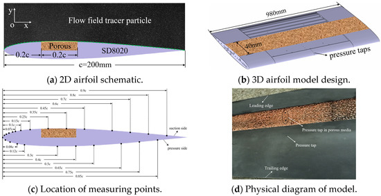 Based on this research background, our paper summarizes the effect laws of porous media parameters on the aerodynamic characteristics of airfoils. We also analyze the mechanism of influence on the surface flow-field structure through balance force and pressure measurements and using a TR-PIV experiment that includes laying porous media with different PPI on the airfoil’s suction side using a wind tunnel’s low-turbulence experimental platform. Our paper’s structural framework is as follows: Section 1 introduces the research background of this paper; Section 2 introduces the experimental model and conditions; Section 3 discusses aerodynamic laws; Section 4 analyzes the flow mechanism from the flow-field test results; and Section 5 summarizes the research content and plans future research.