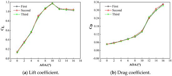 In this experiment, lift force accounted for approximately 8% of the scale in the y direction of the balance, and drag force accounted for approximately 3.5% of the scale in the x direction, meaning both forces conformed to the measurement requirements. Figure 4 shows the smooth airfoil’s force measurement results by repeated balance three times. The figure shows that the three measurements are basically consistent, indicating that the balance has high repeatability.