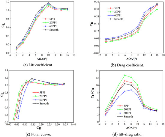 From Figure 5a, we can see that the lift coefficient decreases after laying with porous media, and the decrease becomes more obvious with the increase in PPI. The lift coefficient’s rate decreases more rapidly in the range of small angles of attack and slows down when the angle of attack is larger than 10°. The drag distribution curve in Figure 5b shows that the drag coefficients of the wings laid with 60 PPI porous media increase, while the drag coefficients with 5 PPI and 20 PPI porous media increase and significantly decrease respectively, and with 20PPI porous media they have the highest drag-reduction performance.