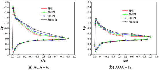 Figure 6 shows the characteristic curves of the airfoil’s surface pressure distribution after being laid with porous media of varying pore density (6° and 12° angle of attack with 10 m/s incoming flow velocity). Figure 6 highlights that the airfoil’s side pressure distribution does not change greatly after laying porous media, while the airfoil’s suction side negative pressure gradually decreases with the reduction in PPI. The negative pressure is considerably reduced, particularly in the porous media area, thereby causing the decrease in lift coefficient, which is consistent with previously mentioned force measurement results. This result may be due to reductions in the porous media’s PPI. When the material’s pore diameter becomes larger, more airflow may enter the interior of the porous media and hinder airflow movement, thus causing the negative pressure to decrease.