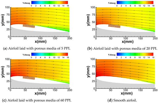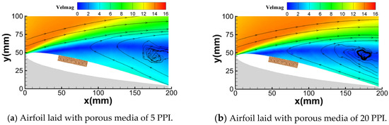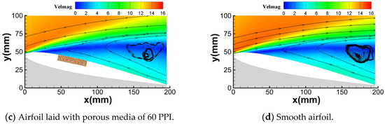 The time-averaged velocity field contours of the suction side are given in Figure 7 and Figure 8, which show models laid with different PPI values of porous media while under the 6° and 12° angles of attack. From Figure 7, we see that the flow velocity of the airfoil laid with porous media shows a decreasing trend at a small angle (AOA = 6°) compared with the smooth airfoil. As the PPI value decreases, the low-speed area at the tail increases considerably. For example, when using 5 PPI, the trailing velocity drops considerably, indicating that the porous media somewhat hinder the airflow movement, thus reducing the circumfluence circulation and leading to reduction in the lift coefficient. From Figure 8, we observed that the airfoil’s suction side separation region is expanded at a large angle of attack (AOA = 12°), likely due to the comparatively rough surface that characterizes porous media. As the PPI value reduces, the separation region gradually increases. Meanwhile, the vortex size in the separation region when laying 60 PPI porous media increases slightly compared with that of the smooth airfoil, while the separation vortex size when laying 20 PPI porous media greatly decreases. This indicates that although 20 PPI porous media has a certain loss of lift, it can weaken the vortex energy and inhibit large-scale vortices to a certain extent, thus improving the airfoil’s aerodynamic performance.