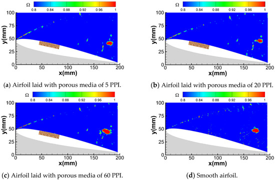 We captured and identifies the vortex characteristics within the separation region on the suction by means of the Ω vortex identification method mentioned above. It can be seen from Figure 9 that the boundary of the vortex core changes after laying the porous media. Compared with the smooth airfoil, the boundary of the vortex core in the airfoil separation area with 60 PPI porous media increases, which may lead to the increase of friction resistance. But the boundary of the vortex core in the airfoil separation area with 5 PPI and 20 PPI porous media is significantly reduced, and the effect caused by 20 PPI is the most significant, greatly improving the aerodynamics. This conclusion is consistent with Figure 8.