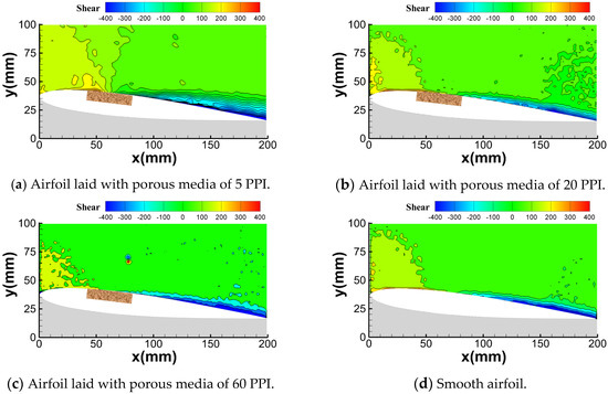 Figure 10 presents the time-averaged shear stress contours at the 6° angle of attack, which consists of the results of 5 PPI, 20 PPI, and 60 PPI porous media laid on both the airfoil and smooth airfoil. Possibly due to the existence of experimental interference factors, the flow field on the test model’s suction side was not completely attached at the 6° angle of attack and still had a small range of separation. As seen from the figure, the surface’s shear layer is thickened due to the existence of porous media, which suppresses the airflow’s velocity on the upper airfoil. However, although the shear layer of the airfoil laid with 20 PPI porous media is thicker than that of the smooth airfoil, the wall shear force is considerably lower, thus reducing the wall friction and improving aerodynamic performance. The reason may be that the size of the 20 PPI porous media pore is similar to the wall’s spanwise vortex, which leads the spanwise vortex to be “locked” in the porous media pore. Because the rolling friction is much less than the sliding friction, other vortices flow smoothly across the wall, reducing the momentum exchange of low/high speed fluid inside/outside the shear layer, thus reducing the shear stress between the fluid and airfoil.