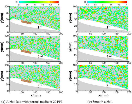 Figure 11 gives three consecutive instantaneous vortex contours based on the Ω-vortex identification criterion at 12° angles of attack for the airfoil laid with 20 PPI porous media and the clean airfoil. From the figure, we observe that the number of vortices increased on the suction side laid with 20 PPI porous media, the vortex size tended to be finer, and the Ω value was reduced compared with the clean airfoil, indicating that the proportion of rotating vortices in this region was relatively small. Meanwhile, porous media can break the large-scale high-energy vortex into more small-scale vortices of low energy, accelerating vortex dissipation and achieving improvements in aerodynamic characteristics.