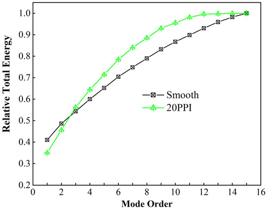 Figure 12 shows the relative energy distribution of the first 15 order modes of the vorticity field on the suction side of the airfoil laid with porous media of 20 PPI and the smooth airfoil at an angle of attack of 12°. From the figure, we observed that the first six order modes’ energy accounts for approximately 70% of the total energy, which indicates that the DMD method used in this test is consistent with the physical characteristics, and its reduced-order reconstruction results are better. In comparison, we found that the airfoil’s first-order mode energy when laid with porous media was less than that of the smooth airfoil, and the first-order modal energy was similar to the average flow field, indicating that porous media can reduce the vortex energy of the average vortex field on the upper airfoil. At the same time, we found that the slope of the first nine order mode curves of the airfoil laid with porous media is considerably larger than that of the smooth airfoil, indicating that the porous media accelerates the main modal vortex dissipation rate.