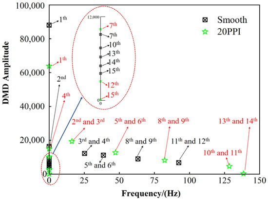 Figure 13 provides the DMD amplitude and frequency distribution of the first 15 order modes of the vortex field on the smooth airfoil and the airfoil’s suction side with a 12° angle of attack for the airfoil laid with 20 PPI porous media. Because the quasi-static mode’s flow field does not change with time, it does not grow or decay, and its frequency is zero, while the drifting mode eigenvalue is zero in the imaginary part; therefore, its frequency is also zero. From the figure, we observed that the DMD amplitude of the first-order mode of the airfoil laid with porous media was considerably lower than that of the smooth airfoil, which corresponds to the results in Figure 12. We also discovered that the conjugate mode appeared earlier after laying the porous media compared with the smooth airfoil, indicating that the porous media sped up the mode evolution process.
