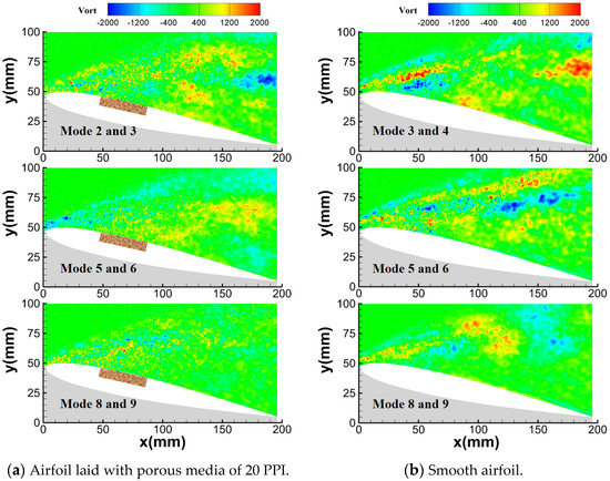 We found that the vorticity gradually decreased with the increase in the mode order, indicating that the vortex gradually lost energy during the evolution process. Comparing the results in Figure 14, we discerned that the vorticity values of the corresponding modes were lower, with the vortex size relatively smaller after laying with the porous media, indicating that the vortex strength was weaker. At the eighth and ninth modes, the smooth airfoil’s vorticity was obviously distinguishable, while the vorticity of the airfoil laid with porous media was almost dissipated, further indicating that the porous media promoted the vortex evolution process.