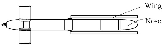 (2) The deployment mechanism is installed in the middle of the UAV fuselage and folded toward the nose. The wing is parallel and close to the fuselage, as shown in Figure 2.