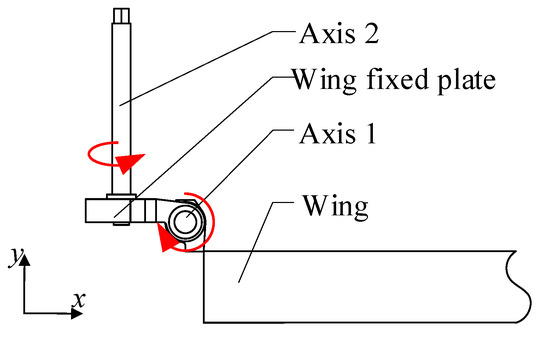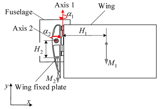where —the moment of inertia of the wing for axis 1; —the moment of inertia of the wing for axis 2; —the wing mass; —the wing fixed plate mass; —the vertical distance from the center of gravity of the wing to the axis of rotating axis 1; —the vertical distance from the center of gravity of the wing to the axis of rotating axis 2.
