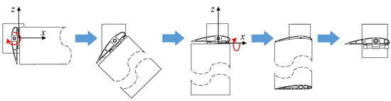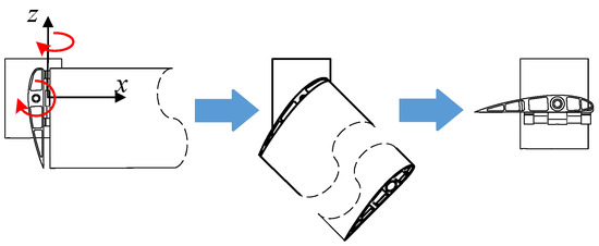 In the stepwise deployment mode of the folding wing, the aerodynamic analysis process of the fixed-axis–non-fixed-axis stepwise deployment mode and non-fixed-axis–fixed-axis stepwise deployment mode is similar. Therefore, only the non-fixed-axis–fixed-axis stepwise deployment mode is analyzed, and its kinetic energy includes two parts of joint axis kinetic energy, as shown in Equation (5). The specific forms of each kinetic energy term are shown in Equation (11).
