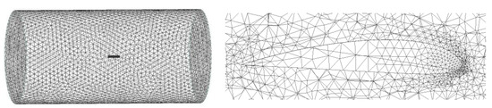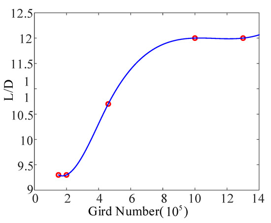 The cylindrical boundary frame is selected for the flow field. The radius of the flow field is 5 m, the length of the flow field is 20 m, and the maximum length of the flow field is 80 times that of the wing chord. In order to select an appropriate number of grids, grid tests are performed on multiple grid numbers. The grid numbers are 1.5 × 105, 2 × 105, 4.6 × 105, 1 × 106, and 1.3 × 106. Figure 9 shows the influence of the number of grids on the lift-to-drag ratio. A greater grid number results in a converging value and more accuracy.