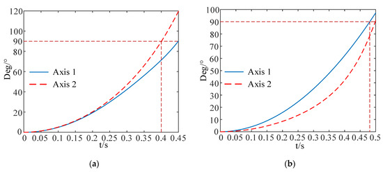 Axis 1 and axis 2 deployment angle and deployment time curve: (a) synchronous deployment mode; (b) non-fixed-axis–fixed-axis stepwise deployment mode.