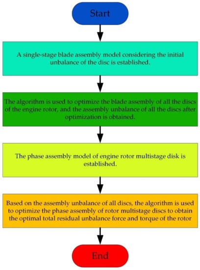 Assembly is very important in the manufacturing process of products, and its results have a significant impact on the final performance and quality of products []. The assembly quality of aero-engines is an important factor to ensure the overall performance of aero-engines. According to statistics, the number of engine failures caused by vibration accounts for 50% to 60% of the total number of engine failures []. The unbalance force caused by excessive rotor unbalance is the main factor causing vibration during the operation of an aero-engine []. The unbalance of the rotor will not only cause vibration but also cause airflow exciting force. Under certain conditions, it may cause rotor instability, which will adversely affect the normal operation of the entire engine. The aero-engine rotor is composed of multi-stage discs and blades. In the process of the rotor assembly, the assembly sequence of blades affects the balance quality of the assembled disc, while the assembly phase angle of multi-stage discs affects the overall balance quality of the rotor. These two factors are important factors affecting the balancing quality of the rotor [].
