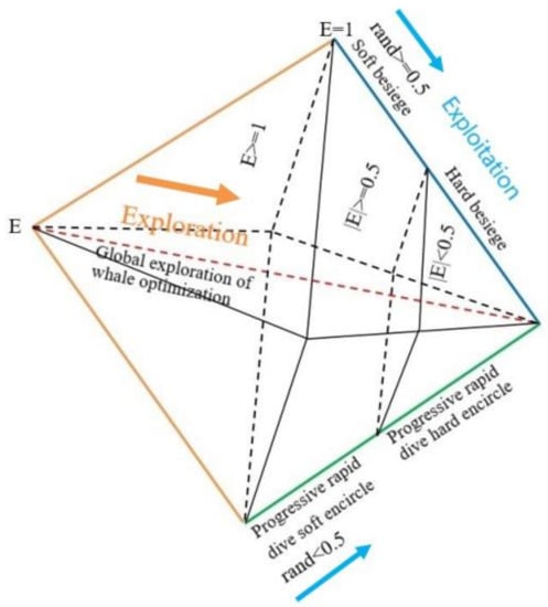 Heidari et al. [] proposed the HHO model method based on the Harris Hawk’s hunting strategy and operator structure of grey wolf optimization and divided the Harris Hawk algorithm into two stages of exploration and development.