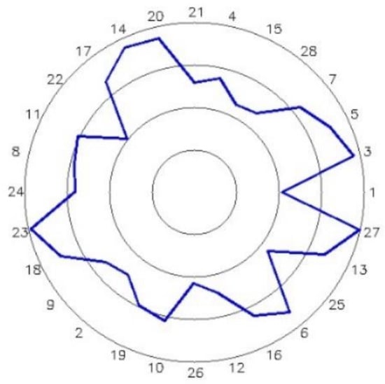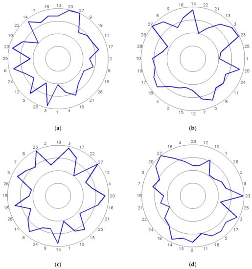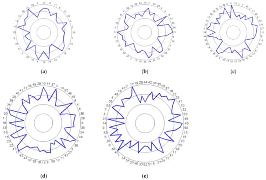 The assembly sequence table (counterclockwise) of the first stage, second stage, third stage, fourth stage, and fifth stage disc blades optimized by the improved Harris Hawk algorithm is shown in Table 7. The phase angle of the multistage blade assembly is optimized by improving Harris Hawk algorithm, and the total residual unbalance force, The optimized blade layout obtained by improving Harris Hawk algorithm is shown in Figure 12.