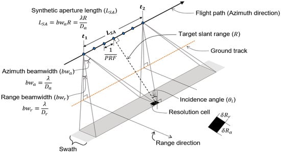 where is the propagation speed of a signal, is the pulse bandwidth, is the incidence angle, which is the angle between the radar beam and the normal to Earth’s surface, is the wavelength of the signal, is the slant range between the satellite and the target, is the synthetic aperture length, which is the moving distance of the satellite when the antenna beam illuminates the target, and is the antenna diameter in the satellite velocity (along-track) direction. However, the spatial resolutions obtained by Equations (1) and (2) are the maximum theoretical values []. In practice, the spatial resolution is degraded by various factors, such as phase error of the received signal and instability of the radar signal [,].