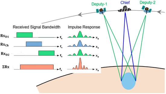In this study, the multistatic SAR concept is applied as a method of increasing for enhancement, as shown in Figure 2 []. The multistatic SAR system for VHRSI is designed as an along-track formation consisting of a chief satellite that transmits and receives signals and two deputy satellites that receive only and make all antennas point to the same target. Consequently, is increased, and is improved by synthesizing signals of various bandwidths received by each satellite.