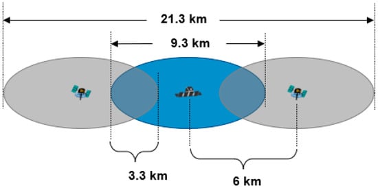 Figure 3 represents the synthetic aperture length of the multistatic SAR system for VHRSI () consisting of three SAR microsatellites with the specifications presented in Table 2. The three ellipses mean the synthetic aperture length of each SAR microsatellite with an antenna length of 2.2 m (), and each is 9.3 km. To satisfy Equation (4), must be set to 20.4 km or more. To meet this requirement, the baseline between satellites is set to 6 km as shown in Figure 3. Consequently, becomes 21.3 km, and the synthetic aperture length of each satellite overlaps by 3.3 km.