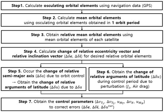 The along-track formation maintenance means keeping the relative argument of latitude () roughly constant, given that the orbital shape of each satellite is similar. The formation maintenance algorithm of multistatic SAR satellites allows for maintaining the relative position by using a method to keep the mean relative orbital elements of the deputy satellite with respect to the chief satellite near the desired value []. Figure 4 is a flowchart of the relative orbit control algorithm for formation flying of a multistatic SAR system, and it will be explained in detail in the subsection.