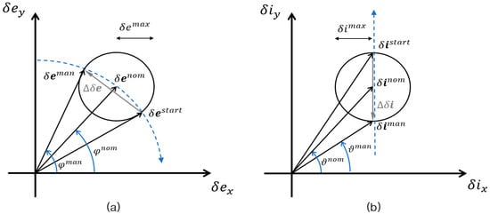 Relative orbit control concept for the relative eccentricity vector (a) and relative inclination vector (b) changed by the secular effect.