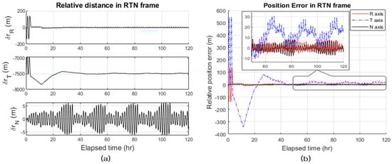 Simulation results of the relative orbit control algorithm. The relative position of the trail deputy satellite (a), and the position error with respect to the nominal relative position (b) in the RTN frame over elapsed time.