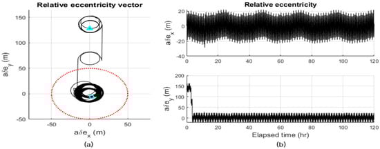 Simulation results of the relative orbit control algorithm. Relative eccentricity vector on the vector plane (a), and relative eccentricity vector elements over elapsed time (b). The triangle and circle markers in (a) are the initial and final positions of the relative eccentricity vector, respectively. The red dotted line is the maximum error boundary for satisfying the relative distance requirement.