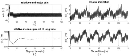 Figure 8 shows the changes in the relative semimajor axis (a), the relative mean argument of longitude (b), and relative inclination vector elements (c) over elapsed time due to relative orbit control. The relative semimajor axis oscillates for 20 m by short periodic geopotential perturbation. Additionally, for in-plane relative orbit control, the center of the amplitude of the relative semimajor axis is controlled based on zero. The relative mean argument of longitude is maintained after converging at the designed relative position of the deputy satellite, −7500 m, through the control of the relative semimajor axis. The relative inclination increased by geopotential perturbations is maintained within 10 m through out-of-plane relative orbit control.