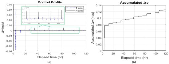 Figure 9 denotes the control profile of the relative orbit control (a) and the accumulated used for relative orbit control (b). To correct the initial relative position error of the deputy satellite, of 75 mm/s was used in the first in-plane maneuver. After the formation was stable, a thrust of approximately 2 mm/s was used for each in-plane maneuver. Out-of-plane maneuvers were performed once every 20 orbital cycles, and the value of used in each maneuver was approximately 7 mm/s. The average per day used for relative orbit control was approximately 11 mm/s, which is within the performance range of the Hall effect ion thruster.