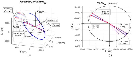 In a near-circular non-equatorial orbit situation, for controlling the relative orbit is obtained through the Gauss’ variation equation that linearizes the variation of the relative orbital elements according to the change in velocity (, , ) in the RTN frame [,]. Here, , , and are the components of with respect to the RTN frame.